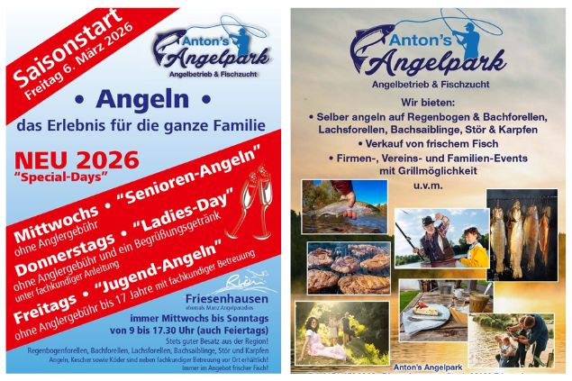 Ob entspannter Angeltag, gemeinsames Familienerlebnis oder besondere Events: Anton’s Angelpark in Friesenhausen steht für Natur, Erholung und fachkundige Begleitung. Von Regenbogen- und Bachforellen bis hin zu Stör und Karpfen – stets mit gutem Besatz aus der Region.
